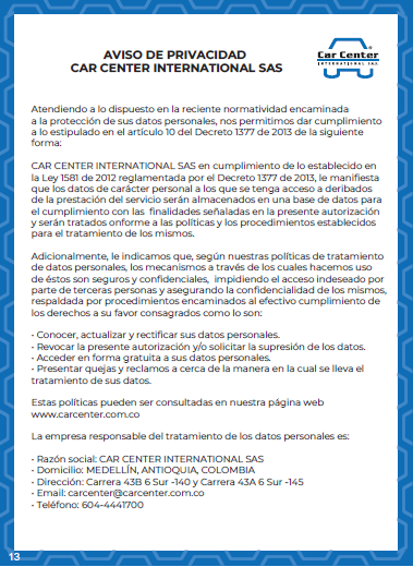 almacenados por la compañía CAR CENTER INTERNATIONAL SAS, en virtud del desarrollo de su objeto social, en su calidad de responsable y encargado del tratamiento.